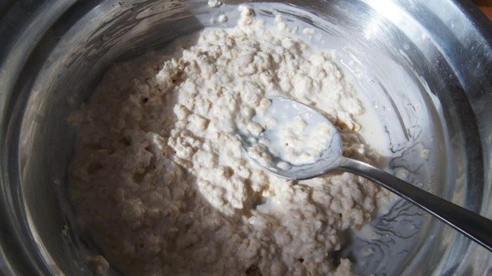 Хлопья смешать с ряженкой (или кефиром) и оставить на 10 минут набухнуть. Мерный стакан у меня 200 грамм.