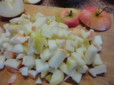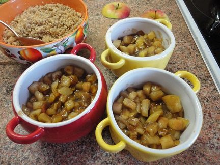 Рецепт расчитан на две формочки. Возможно, у автора они большей емкостью. У меня всех продуктов хватило как раз на три формочки. Поэтому третью яблочную крышечку пришлочь срезать еще с одного яблока, которое не входит в начинку.