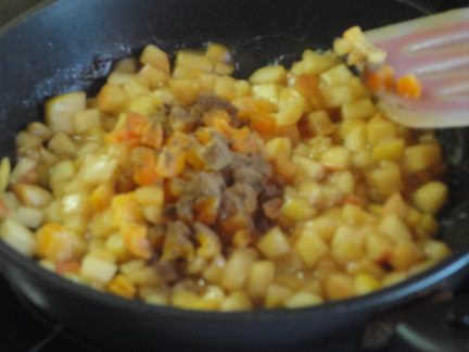 Немного обжарить, затем добавить абрикосовое пюре и тушить минут 5.