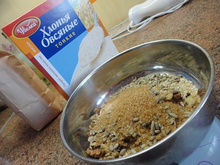Смешать овсяные хлопья, орехи, семечки, коричневый сахар и измельчить блендером.