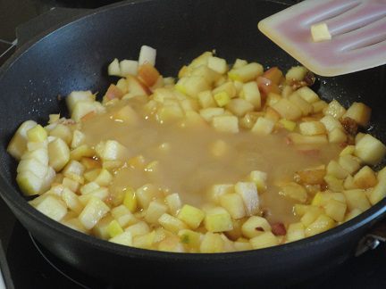 У 2 яблок срезать верхние части — крышечки и нарезать кубиками. В сковороде растопить сахар и добавить к нему яблоки.