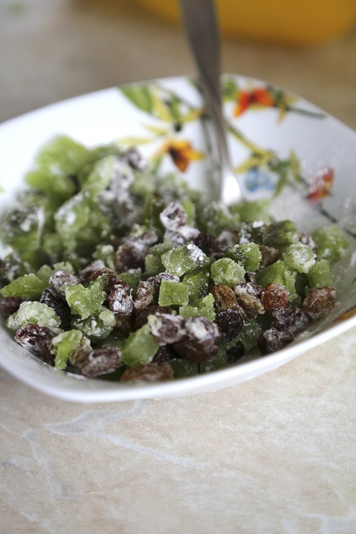 Изюм промыть, обсушить. Цукаты нарезать, добавить к изюму. Прибавить 1-2 ст.л. муки и перемешать.