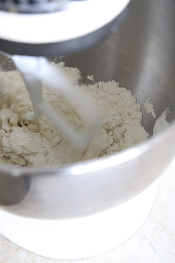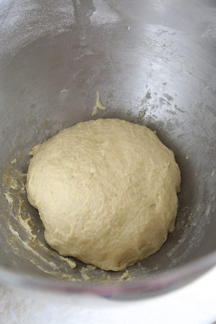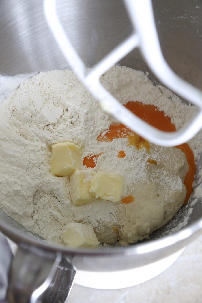 В миску с опарой добавить сливочное масло, желток, сахар, оставшуюся муку, соль, пряности. Хорошо вымесить тесто (5-6 минут в стационарном миксере).