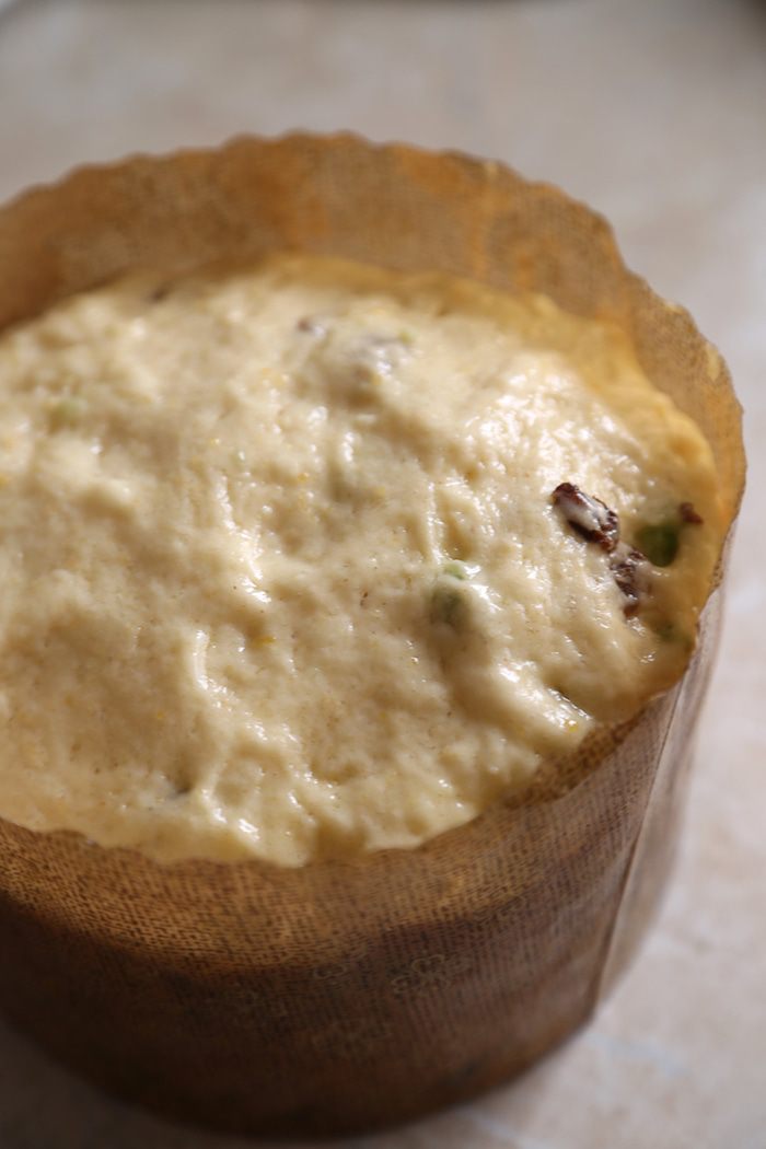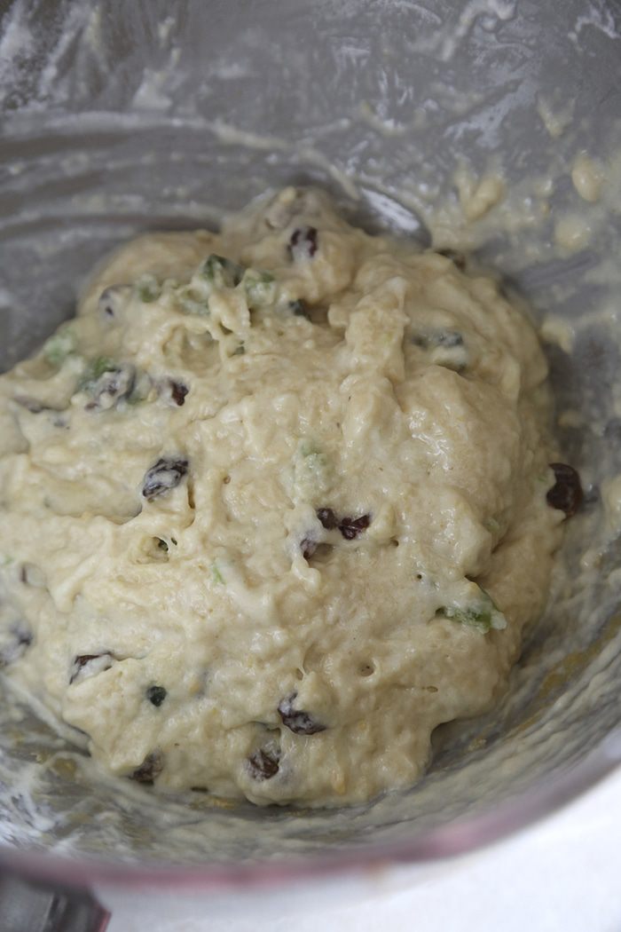 Взбить белок. Вмешать в тесто цукаты и взбитый белок. По необходимости смазать руки (при ручном замесе) или миску растительным маслом, так как тесто будет довольно липким.