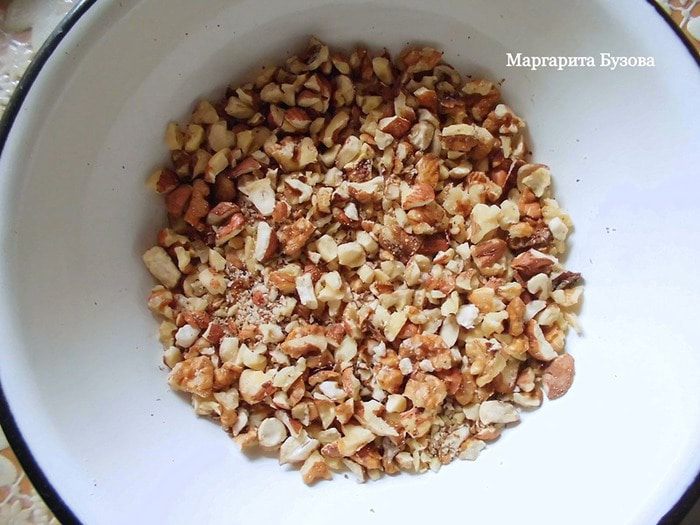 В полученную шоколадную массу положить кокосовую стружку и где-то половину орехов. Еще раз тщательно перемешать. Если шоколад начнет сильно густеть, тут же поставить его на водяную баню.