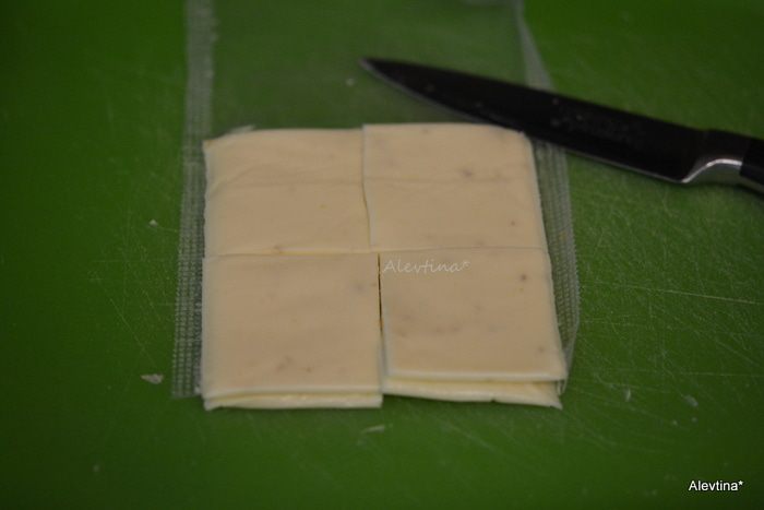 Сыр пластинками разрезать на 4 части. За 5 мин до окончания выложить по квадратику поверх каждой фрикадельки. Вернуть в духовку на 5 мин.