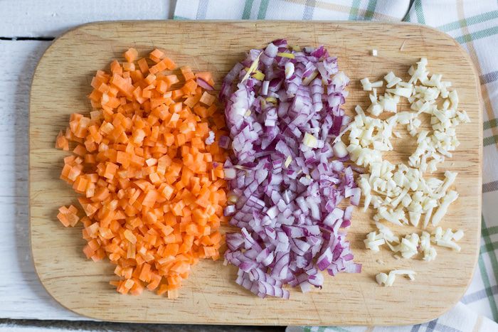 Лук и чеснок порубите, морковь нарежьте кубиками.