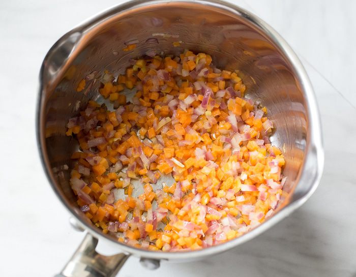 Разогрейте оливковое масло в большом сотейнике на среднем огне и обжаривайте на нем лук с морковью около 10 минут до мягкости.