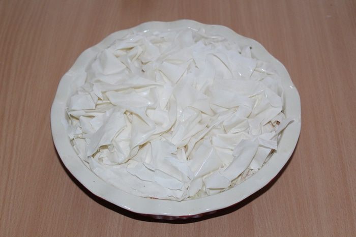 Разложить лист теста фило. Смазать его маслом и рукой слегка «смять» тесто, чтобы получились «складки».