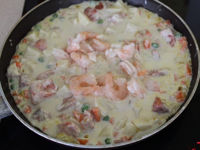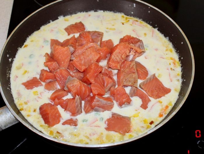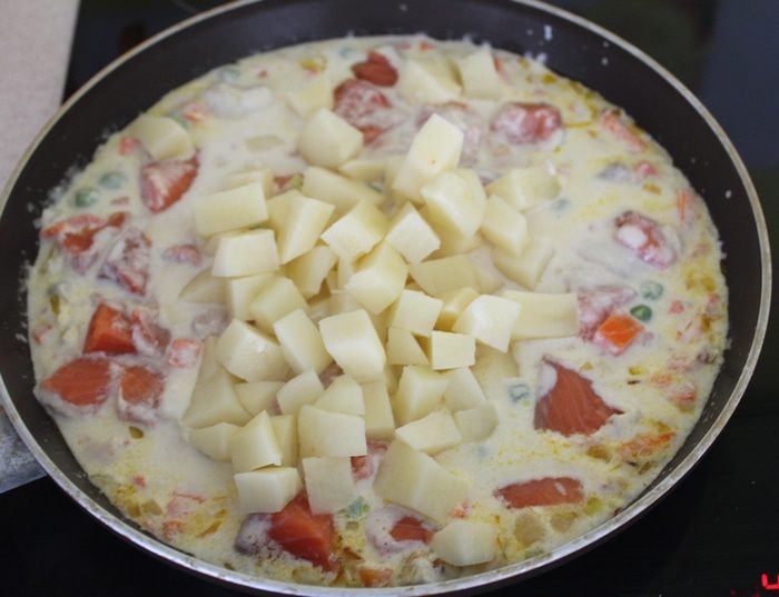 Добавить порезанный мелкими кубиками картофель (я сделала немного неправильно, добавила его не первым. В результате он немного был альденте, поэтому не обращаем особого внимания на то что на фото уже есть рыба). Потушить минут 5.