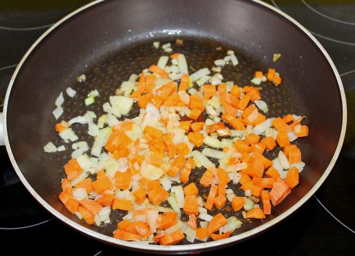 В сковороде растопить сливочное масло. Добавить мелкопорезанный лук, готовить 3 минуты, добавить морковь, готовить еще 3 минуты, помешивая. Добавить чеснок, готовить еще 1 минуту.