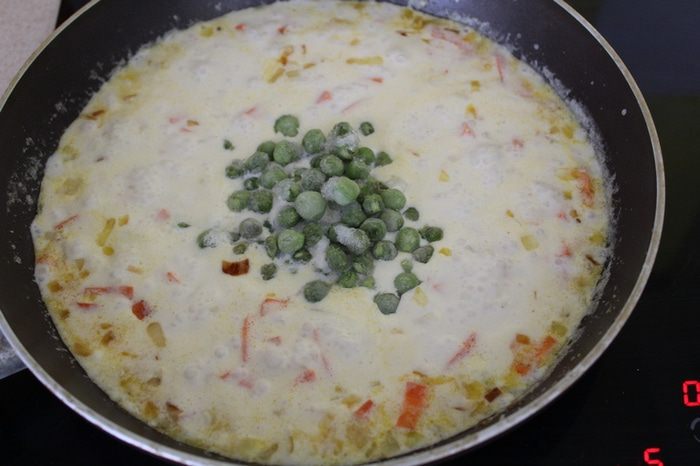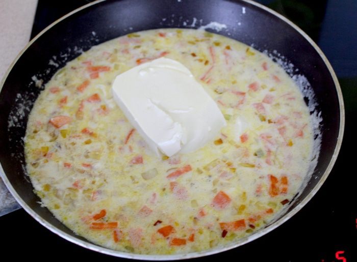 Добавить молоко, довести до начала кипения и добавить сливочный сыр. Готовить, помешивая, до расплавления сыра. Убавить огонь на минимум.