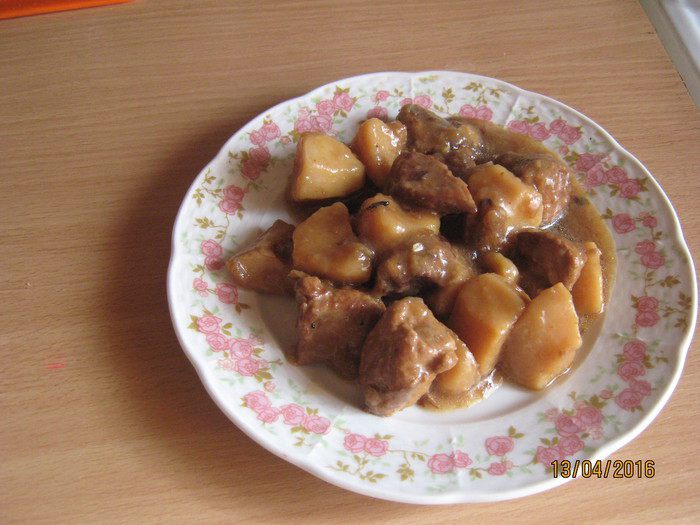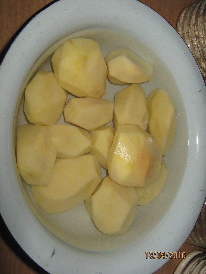 Все заливаем водой, чтобы вода накрыла картофель. Добавляем соль. Ставим тушиться на 1.5-2 часа. За 20 мин. до готовности добавляем лавровый лист для вкуса, можно положить и перец горошком.