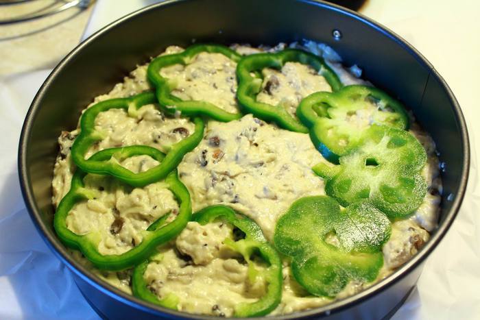Форму застелить бумагой для выпечки, уложить тесто и отправить в разогретую до 190°C духовку. Я украсила сверху болгарским перцем :)