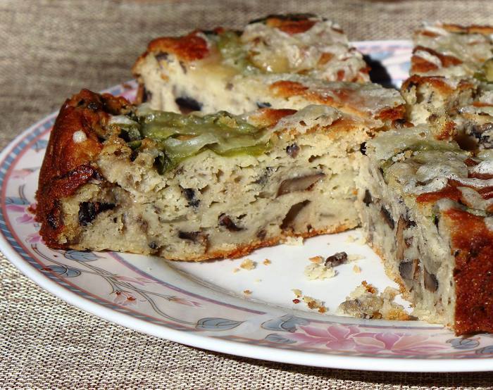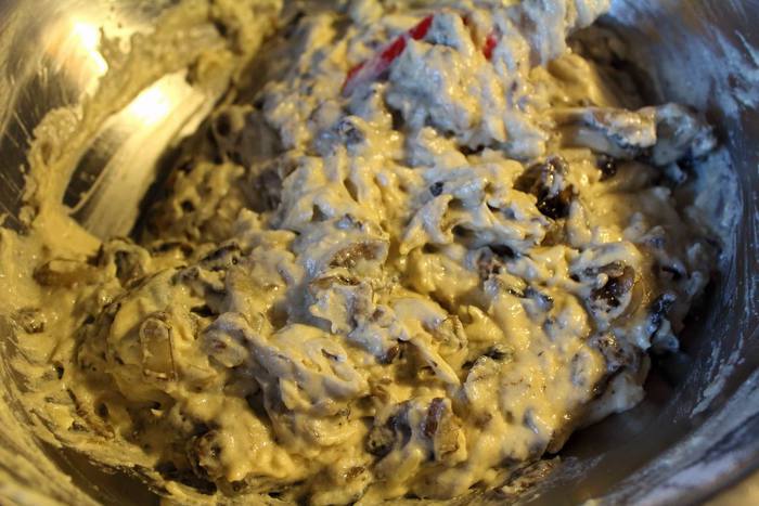 Смешать с сухими ингредиентами, затем вмешать обжареные с луком грибы.