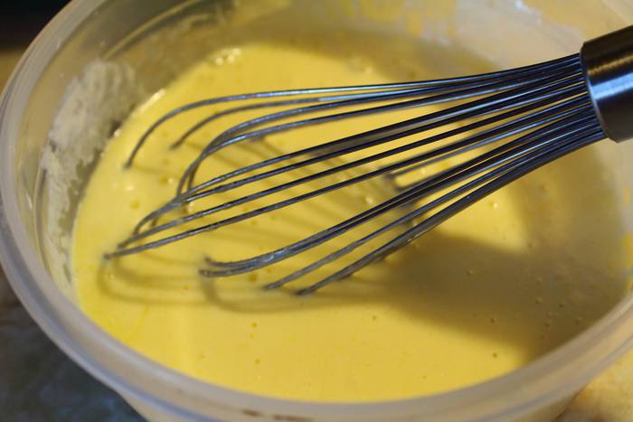 Смешать до однородности яйца, кефир и растопленое сливочное масло.