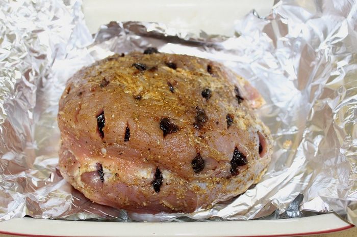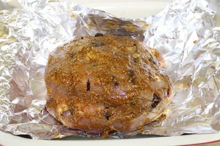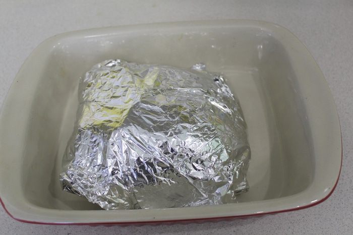 Завернуть плотно в фольгу. Запекать в предварительно разогретой до 180°C духовке 1,5 часа.