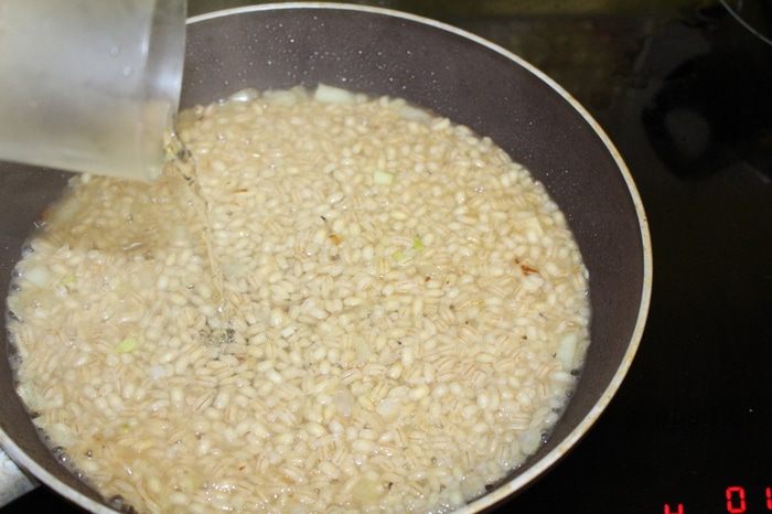 Затем влить вино, дать ему впитаться. Порциями подливать горячий бульон, каждую порцию после того, как впитается предыдущая.