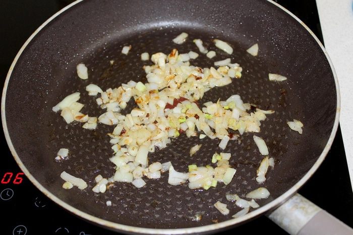 Разогреть оливковое масло в сковороде и потушить мелко порезанные лук с чесноком.