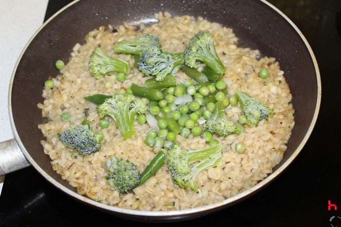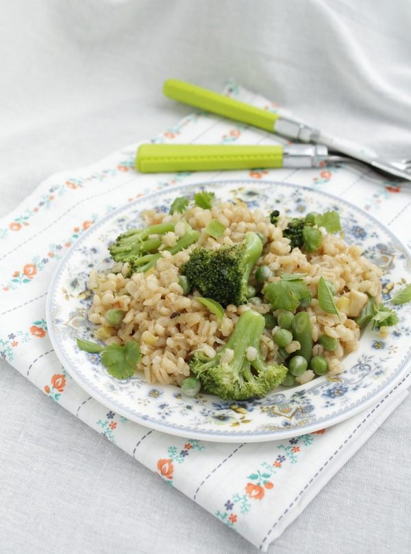 Когда перловка будет практически готова, примерно через 40 минут, добавить горошек и брокколи и зеленую стручковую фасоль. Довести овощи до готовности, но чтобы они сильно не размякли, а были немножечко альденте. Посолить. Поперчить по вкусу.