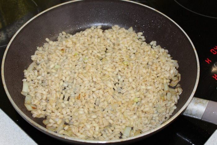 Добавить перловку (у меня перловая крупа от "УВЕЛКИ" быстрого приготовления), тушить, помешивая, чтобы она пропиталась маслом.