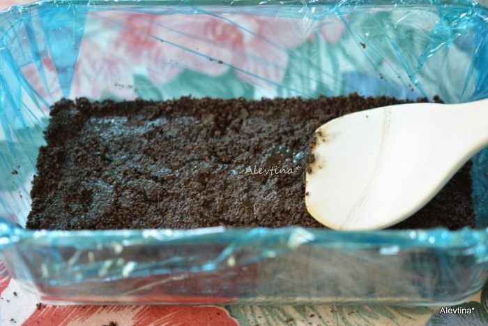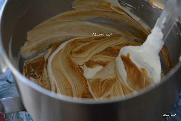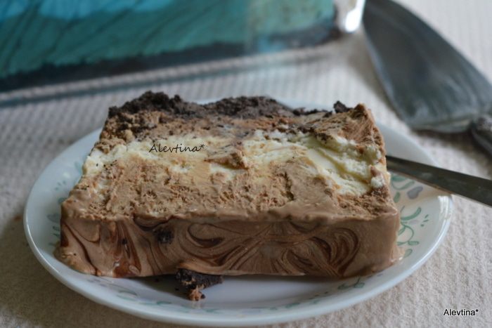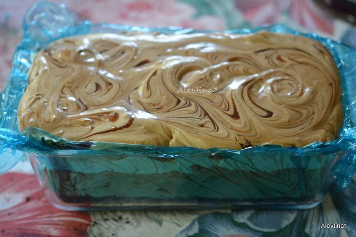 Выложить часть сливки со сливочным сыром и кофе в форму, добавить шоколадный сироп, перемешать,затем белую часть смеси, вновь сливки с кофем и шоколадный сироп. После каждого раза перемешивать ножом, рисуя круги. Поставить на 6 часов в морозильник или на ночь.