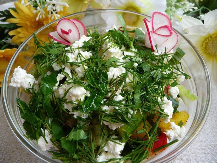 Наступила весна, пора готовить легкие салаты. Предлагаю овощной салат с добавлением творога и сельдерея. Сельдерей полезен тем, что в нем мало калорий. Стеблевой сельдерей можно добавлять в любой овощной салат, чуть пряный вкус зелени отлично сочетается со всеми овощами.