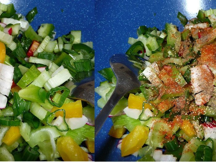 Овощи перемешать, добавить специи. Вместо чеснока у меня чесночный порошок.