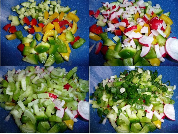 Овощи (огурец свежий, три вида перцев, редис, сельдерей) порезать кубиками, лук кольцами.