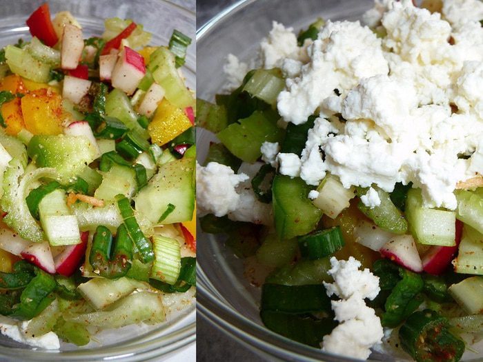 В салатницу выложить слоями половину подготовленных овощей. Добавить 1 ст. л. творога, сверху овощи и опять творог.