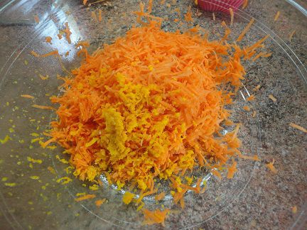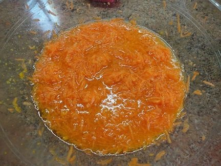 Добавляем растительное масло, свежевыжатый сок апельсина, теплую воду и сахар. Перемешиваем и оставляем, чтобы сахар растворился.