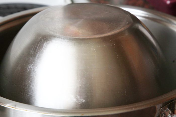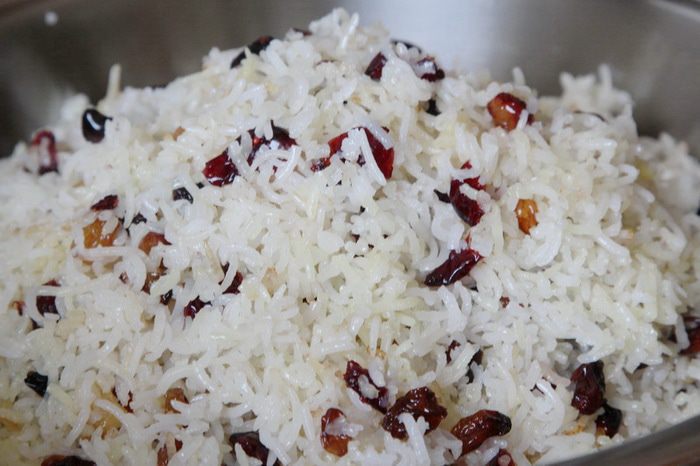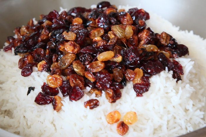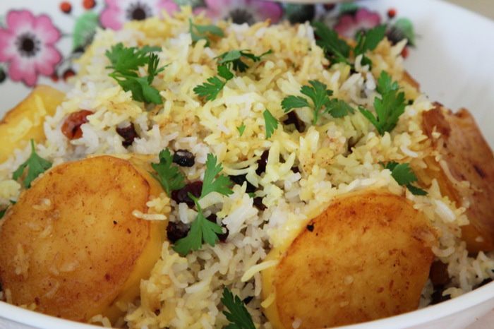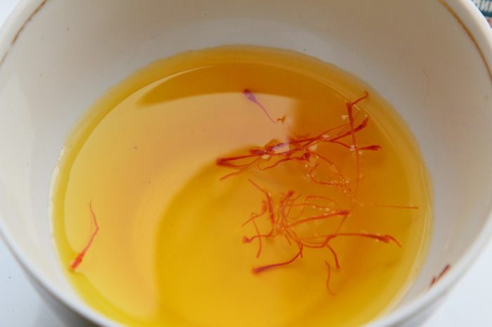Шафран заливаем теплой водой (50 мл). Хорошо промываем рис, заливаем его водой и отставляем на 2 часа. Через 2 часа эту воду сливаем. Наливаем в кастрюлю, емкостью 3 л, воду — 2,5 л, добавляем 1 столовую ложку соли и доводим до кипения. В кипящую воду отправляем рис на 2 минуты. Приготовленный рис отбрасываем на дуршлаг и оставляем стекать воду.