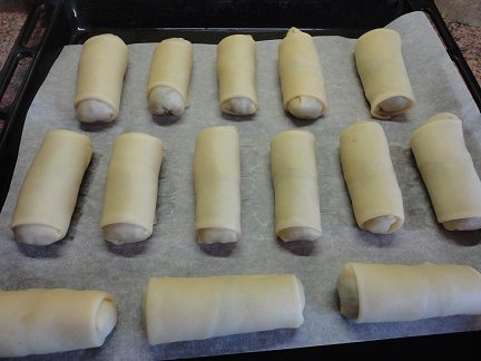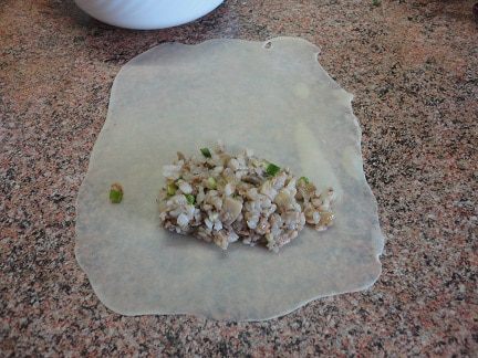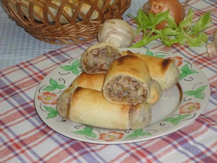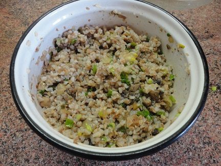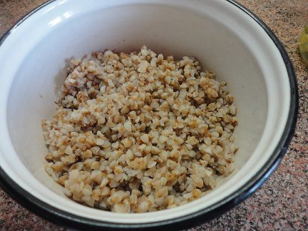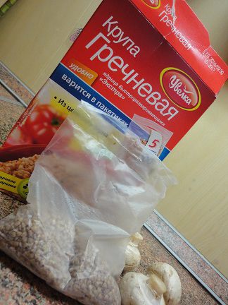 Пока варится гречка и отлеживается тесто, мелко нарезаем лук, жарим его до золотистого цвета, затем продолжаем жарить с мелко нарезанными шампиньонами минуты 3. Солим, перчим по вкусу, добавляем молотый кориандр. Это тоже по вкусу. Сварившуюся гречку освобождаем из пакетика. Она очень рассыпчатая.