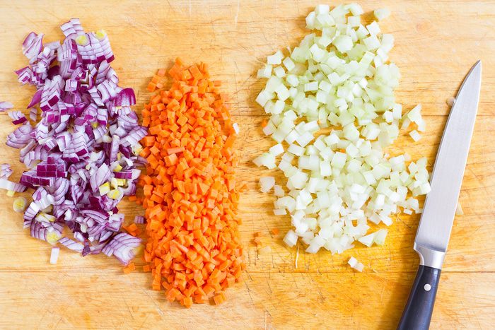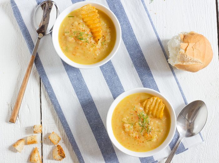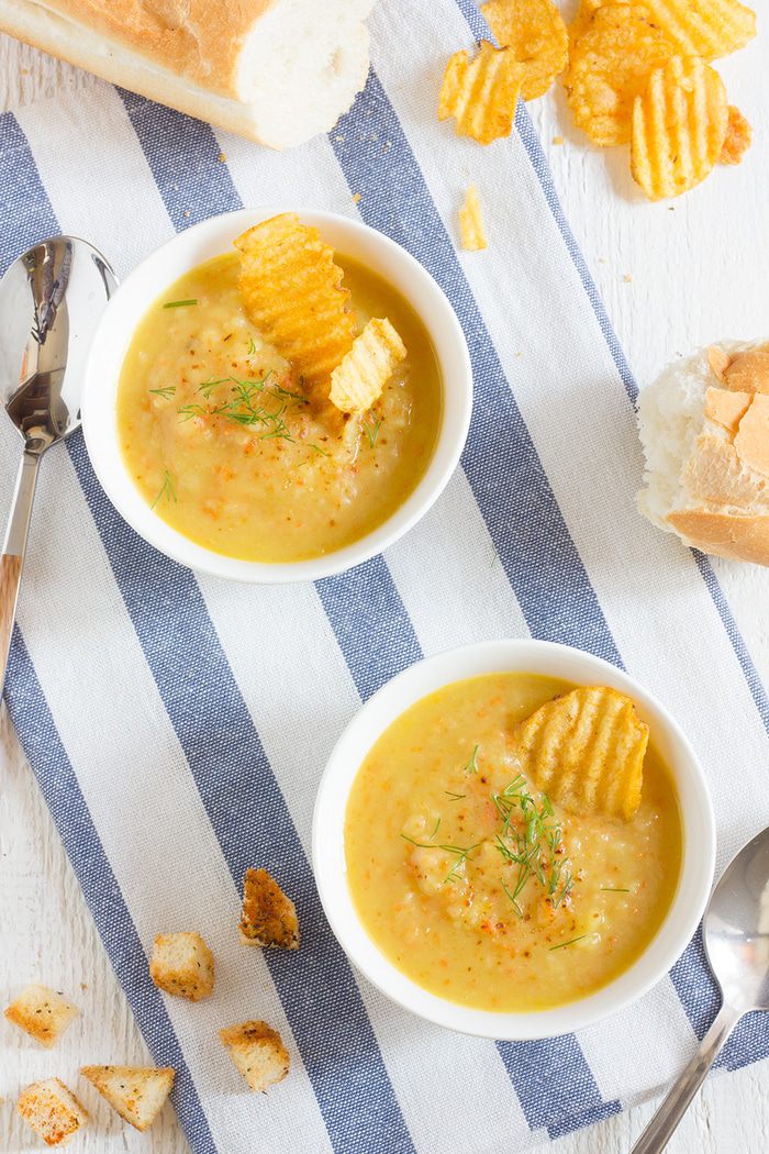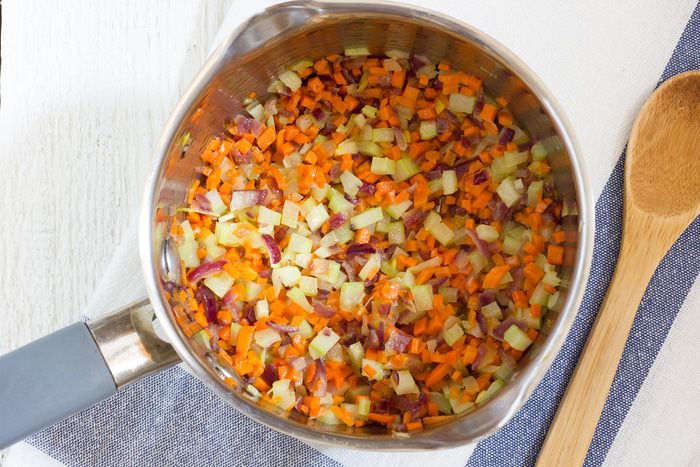 В сотейнике разогрейте оливковое масло на среднем огне и обжаривайте на нем лук до мягкости примерно 10 минут, добавьте чеснок, морковь и сельдерей и жарьте еще 3-5 минут до золотистого цвета. Добавьте картофель в сотейник, посолите и готовьте 5 минут. Влейте 1,25 литра овощного бульона, доведите до кипения, и добавьте копченую паприку и карри, убавьте огонь и варите 30 минут.