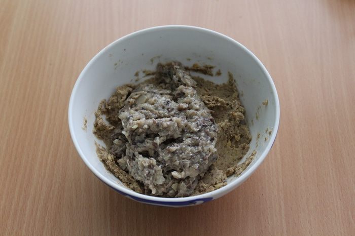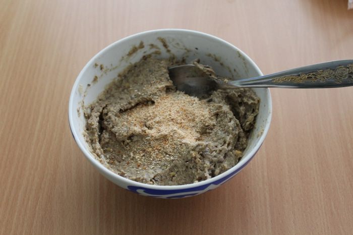 Лук и чеснок измельчить и обжарить на растительном масле, добавить грибы. Затем мелко измельчить и добавить к чечевице. Перемешать.