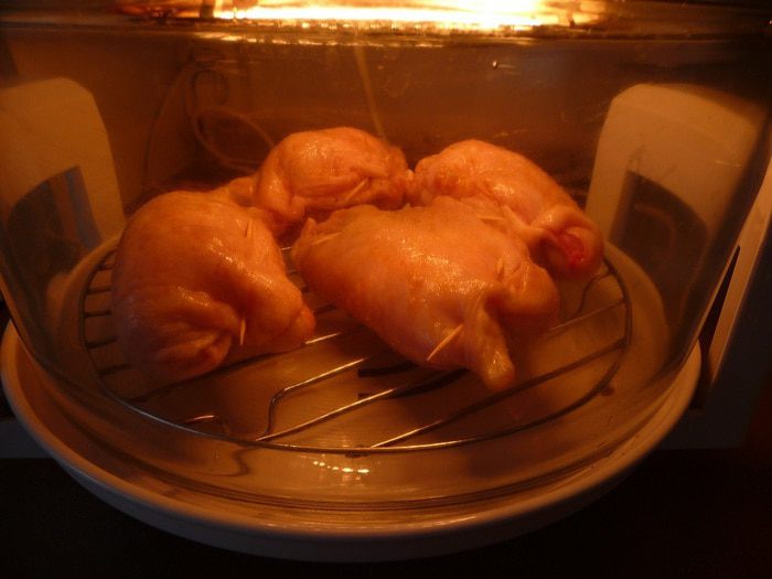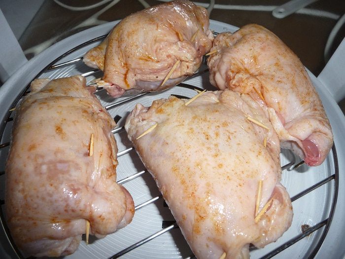 После приготовления, вынуть окорочка на тарелку и дать им отдохнуть 5 мин.