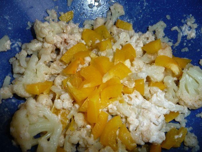 Цветную капусту отварить в подсоленой воде 5 мин. Слить воду. Добавить перец, чесночный порошок, майонез. Перемешать.