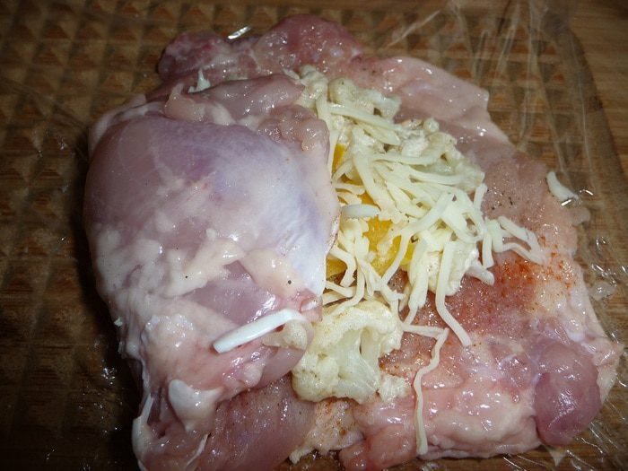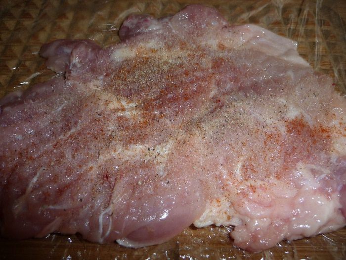 Положить на пищевую пленку, накрыть ей и отбить. Отбитый окорочок посолить, поперчить, добавить порошок чесночный.