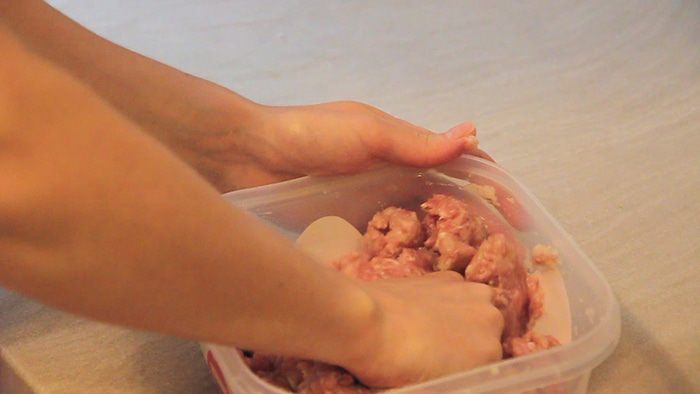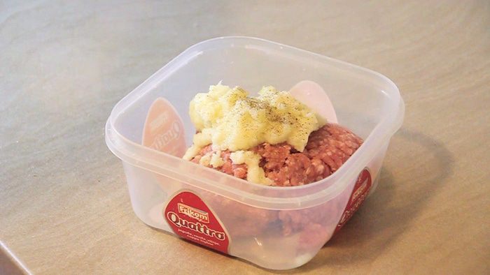 Добавляем получившеюся смесь в емкость с фаршем. Солим и перчим по вкусу.
