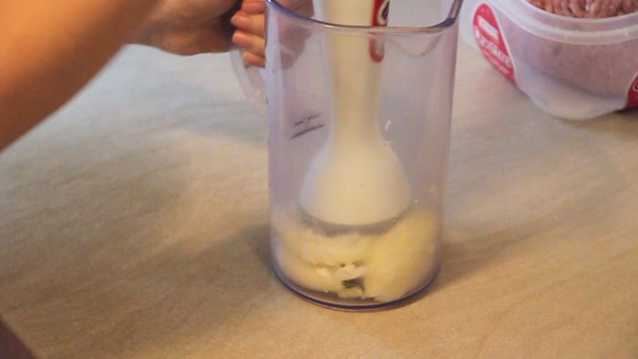 Тем временем подготавливаем фарш. С помощью блендера измельчаем одну луковицу и один зубчик чеснока.