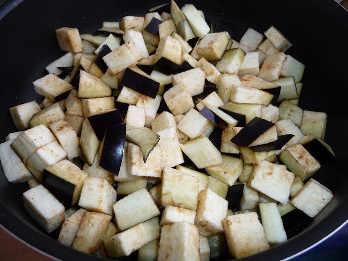 Баклажан порезать небольшими кубиками. Обжарить в разогретом растительном масле до румяного состояния.