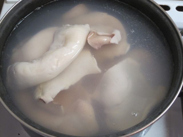 Вымыть кальмары, очистить от пленок, отварить в кипящей подсоленной воде в течение 3 минут.