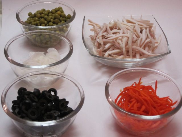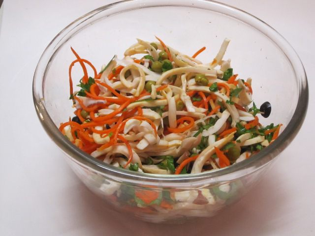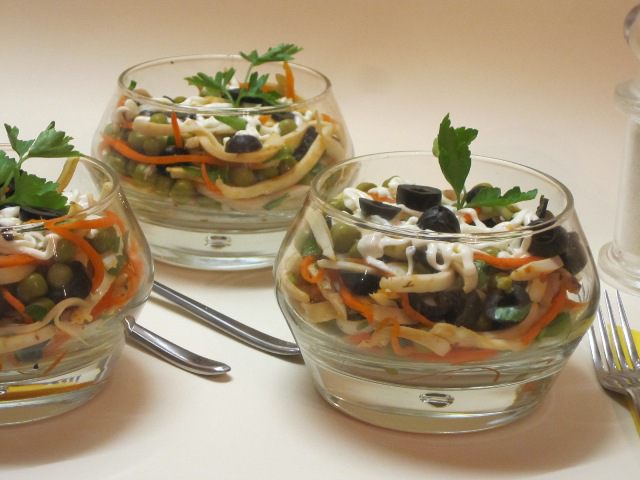 Рецепт этого салата я увидела в кулинарной газете «Смак» много лет назад, приготовила, очень понравился, так как я люблю блюда с кальмарами и другими морепродуктами. Приготовила салат и до сих пор продолжаю готовить)