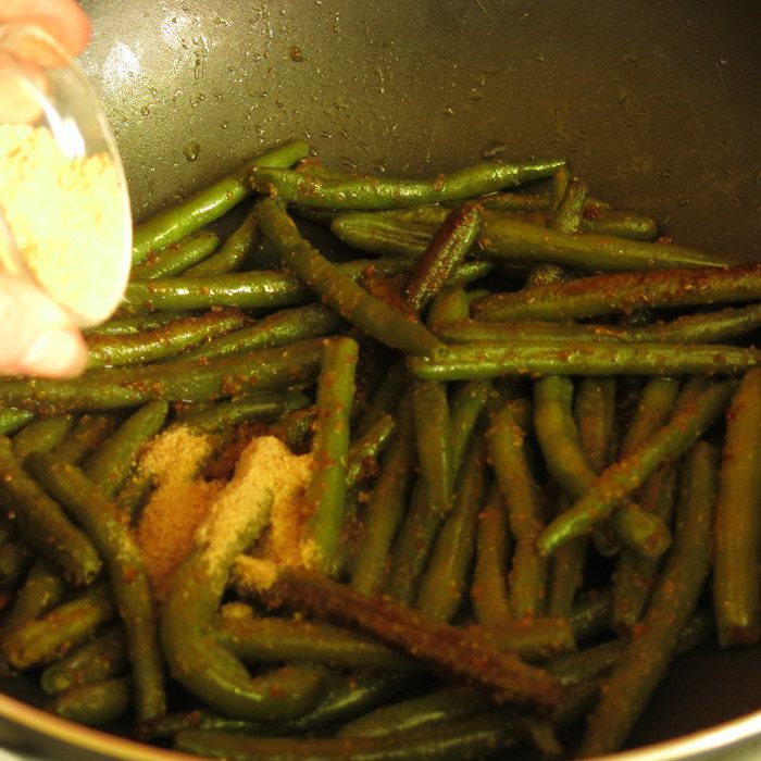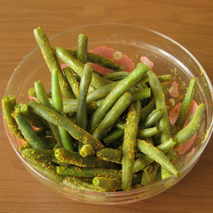 Отрезаем хвостики, у свежей фасоли это можно сделать до варки, пересыпаем заготовку травами.