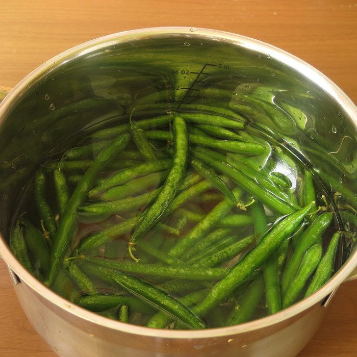 Отвариваем фасоль — заливаем холодной водой, солим и варим с момента закипания 7 минут, свежую фасоль варим меньше. Успех этого блюда определяется качеством фасоли, она должна быть молодой, без прожилок жестких.