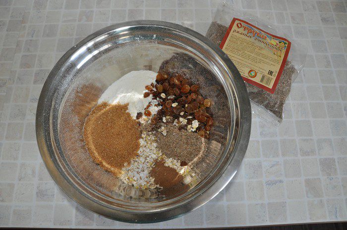Добавить муку, сахар, изюм (обсушить на полотенце), корицу, соль и 1-2 столовые ложки отрубей. Я использовала ржаные с имбирем.