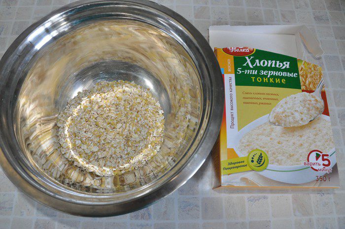 В большую миску положить овсяные хлопья — у меня 5-зерновые хлопья от "Увелки".
