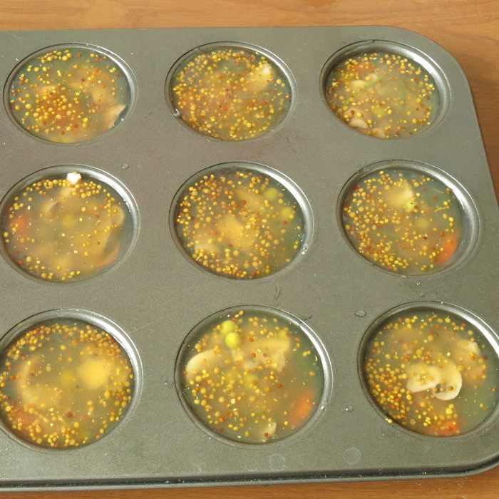 В остатки агар-агара, доливаем 50-70 бульона теплого, чуть застывшая масса растворяется, кладем горчицу в зернах, перемешиваем и наливаем в формы жидкость, даем застыть, на агар-агаре застывает быстро. Приятного аппетита!