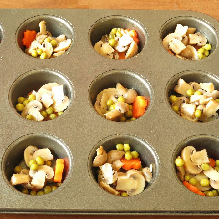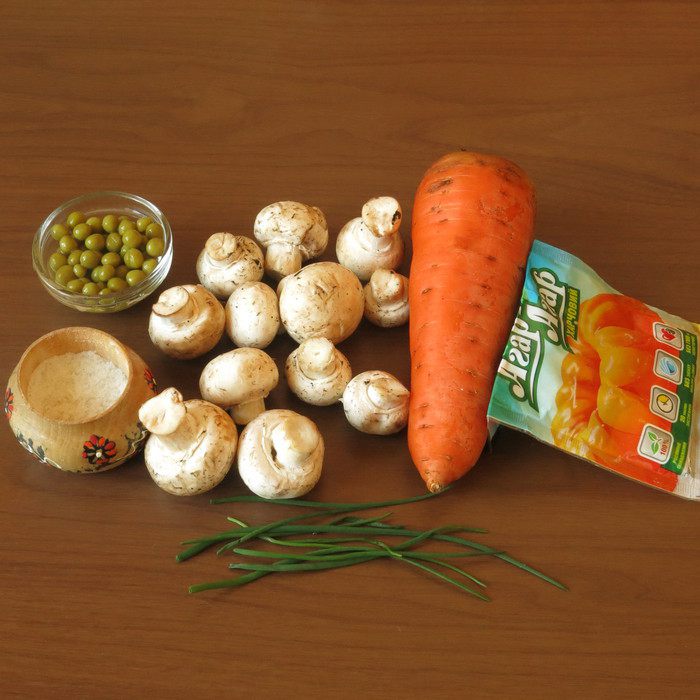 Дно формочек смазываем слегка маслом растительным. Раскладываем морковь, грибы, горошек — набор стандартный для знакомого с детства рецепта. Иногда хочется более простых рецептов, с малокомпонентным составом, минимум специй.