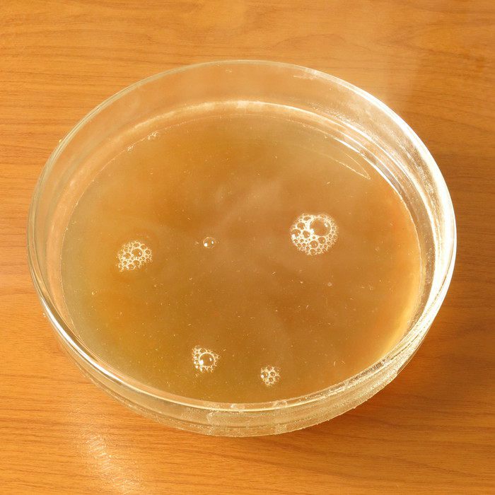 Заливаем агар-агар 150 мл полученного бульона. Оставляем на час. Не постный вариант можно осветлить яйцом или сметаной. Наш вариант будет натуральным.